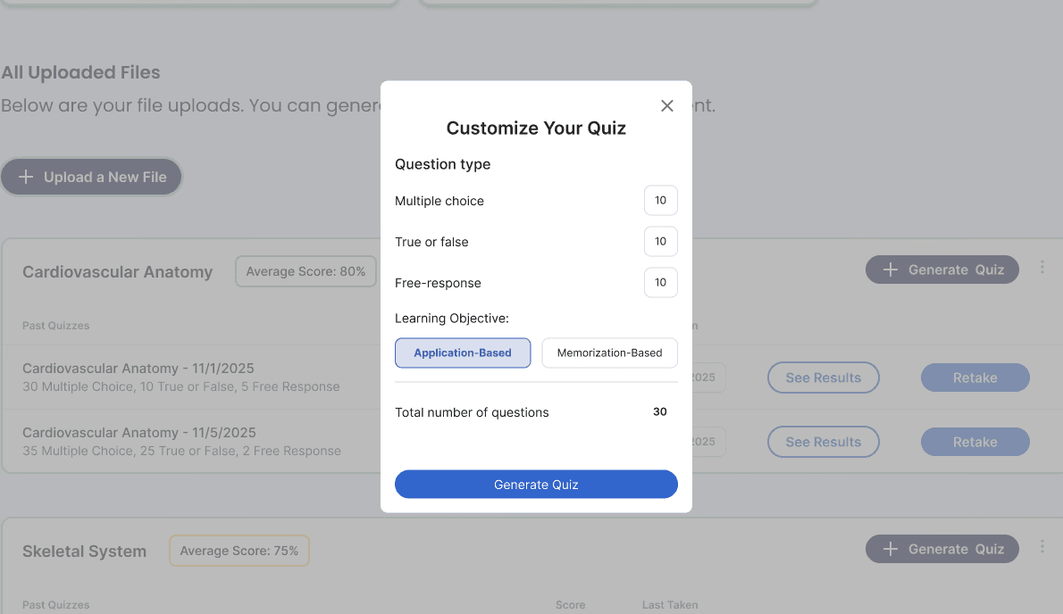 Learvo instantly turn your materials into high-quality quizzes and flashcards so you can skip the busywork and start studying right away.